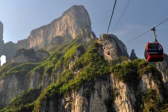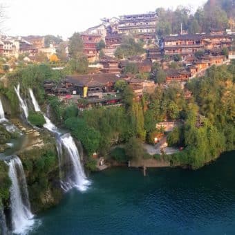 Ce matin montez la Montagne Tianmen en empruntant le plus long téléphérique du monde (7455 mètres). La montagne, 1518 mètres d’altitude au-dessus du niveau de la mer, est la plus haute montagne à Zhangjiajie. Petite marche autour du promontoire, en passant sur des passerelles en verres accrochées sur les falaises, jusqu’à la grotte de Tianmen et d’une arche rendue célèbre par des pilotes russes l’ayant traversé en avion. Descente de la montagne en empruntant le plus long escalator du monde, puis à pied sur un grand escalier en contrebas de l’arche. Déjeuner. L’après-midi, route vers la vieille ville Miao de Furong, accrochée en arc de cercle autour d’une grande cascade, encore peu visitée par les occidentaux. Dîner. Nuit à Furong au Tuwang Xing Gong Hotel, aménagé en espalier au dessus des chutes. C’est un grand bâtiment de style Miao traditionnel qui s’accroche dans la verdure sur le flanc de la falaise. Chambres avec une vue imprenable sur les chutes.