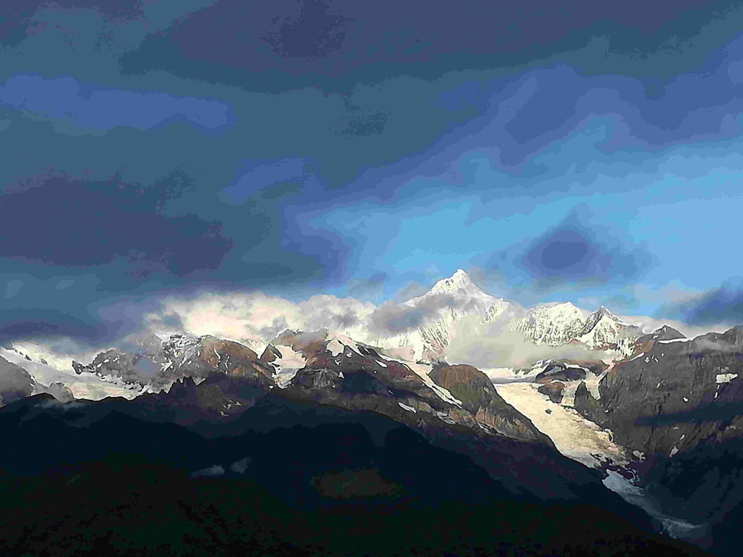 Superbe lever du soleil sur les Montagnes de Meili et les premiers rayons du soleil venant lécher les pentes enneigés du Kawa Karpo. Route ensuite vers Benzilan à travers les trois cols des monts du cheval blanc. Passages à plus de 4000 mètres d’altitude ! En chemin, très jolis points de vue sur le massif puis sur le fleuve Yangtsé. Arrêt dans une petite nonnerie locale.