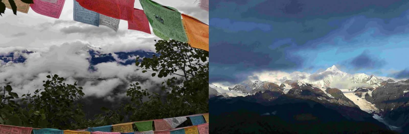Superbe lever du soleil sur les Montagnes Meili et les premiers rayons du soleil venant lécher les pentes enneigés du Kawa Karpo. Route ensuite vers Benzilan à travers les trois cols des monts du cheval blanc.