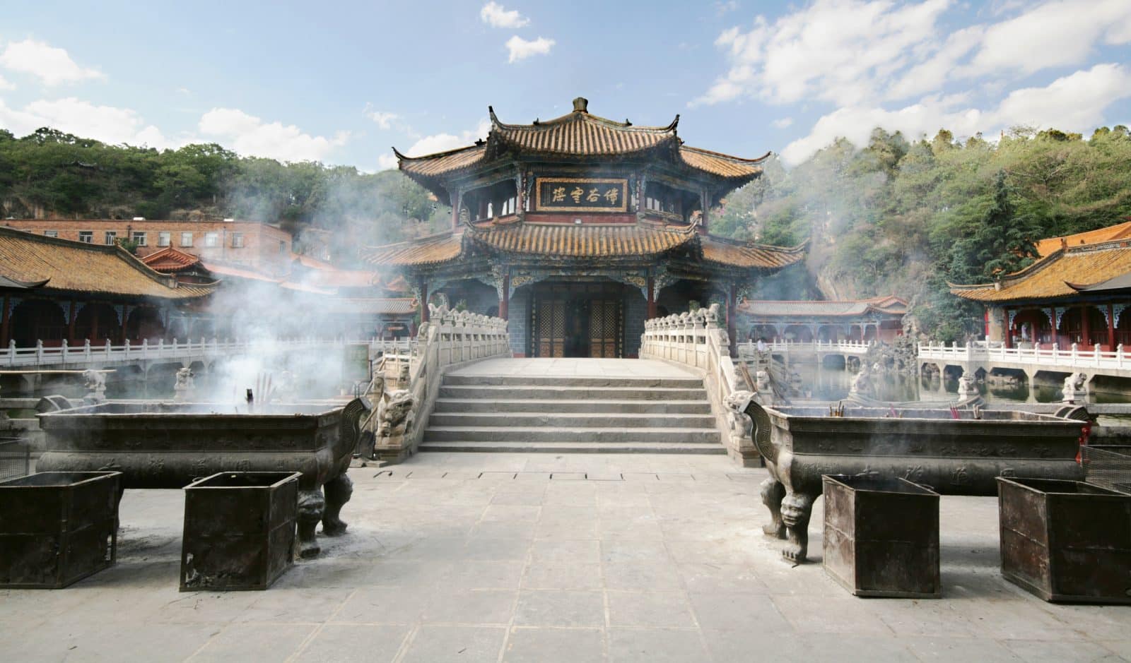 Découverte de la ville à pied, avec notamment une balade dans le quartier du lac d’émeraude où les locaux, seuls, en couple, entre amis ou en famille aiment flâner, chanter, danser et jouer de la musique du matin au soir, surtout le week-end ; des scènes de vie sereines et joviales pour une première approche chaleureuse de la Chine, de ses peuples et de leur culture. Bienvenue au Yunnan ! Continuation jusqu’au temple Yuantong, non loin de là. Nuit à l’hôtel Grand Park 5*.